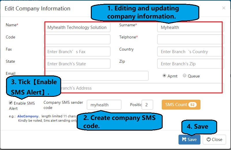 a. The users can search the company by enter the name and system will showed the searching result. i) The system will showed total branch list, company name, contact number, person in charge and registration name. ii) The system will also display how many users count, customers count and appointments count. b. For editing and updating company information, the users are required to select the company and click【Update】. i) The users are required to create company SMS code (for example, AbcCompany, length limited 11 characters or numbers, space or any special character is not available. Kindly be noted, SMS alert sending only available in Singapore,$0.85 per SMS). ii) Tick【Enable SMS Alert】and【Save】.