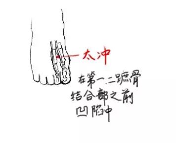 太冲穴:足背侧,从第1与第2脚趾的趾缝向上量约一横指处。